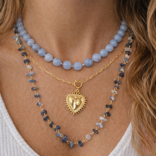 Este collar, inspirado en Teresa de Calcuta, representa la sencillez y el amor entregado a los demás. La ágata azul y la ágata azul picada evocan calma, paz y confianza, recordando la serenidad con la que una vida dedicada al servicio puede transformar el mundo. El dije de corazón simboliza la caridad y la compasión: amar sin medida, escuchar con paciencia y cuidar a quien más lo necesita. Es una pieza pensada como un recordatorio diario de que los pequeños actos de amor también pueden dejar una huella inmensa.