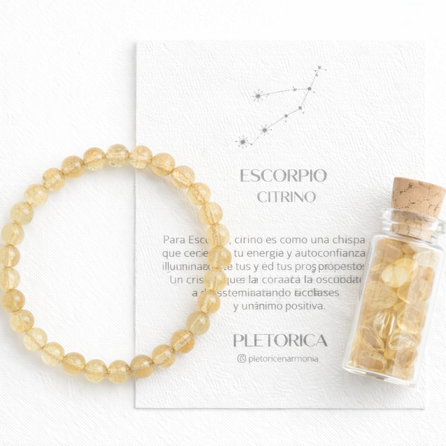 El citrino se asocia con Escorpio porque equilibra y potencia su energía profunda, intensa y transformadora. Escorpio es un signo de agua que vive las emociones con gran fuerza, y el citrino —una piedra de tono dorado y vibrante— aporta luz, claridad y alegría a esa intensidad. Esta piedra ayuda a transmutar emociones densas en fuerza creativa, a atraer abundancia y a fomentar la confianza personal sin caer en el control o el dramatismo. Es como un rayo de sol que ilumina el mundo interior de Escorpio, despertando su poder personal desde la armonía.