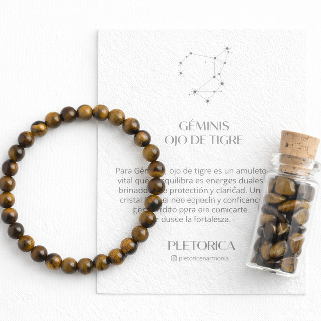El ojo de tigre se asocia con Géminis porque equilibra su energía mental activa con estabilidad, enfoque y confianza. Géminis es un signo de aire, curioso, comunicativo y con una mente que nunca se detiene; el ojo de tigre, con sus reflejos dorados y terrosos, ayuda a enraizar sus pensamientos, tomar decisiones con claridad y protegerse de distracciones o influencias externas. Esta piedra potencia su intuición sin perder la lógica, dándole seguridad para expresarse con autenticidad y mantener el equilibrio entre su dualidad natura